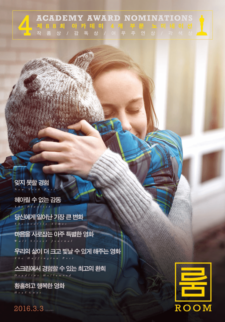 영화는 2016년에 개봉한 레니 에이브러햄슨이 감독을 맡았다. 이 이야기는 엠마 도노휴의 동명 소설이 원작이며 소설 또한 2008년 오스트리아에서 밝혀진 '요제프 프리츨 친딸 감금 강간 사건'이 모티브가 되었다. 당시 개봉부터 높은 평가를 받았고 88회 아카데미에서 조이역의 브리 라슨이 여우주연상을 수상하였다. 영화의 내용은 17세의 조이가 닉이라는 남자에게 납치, 강금되었고 반복적인 강간으로 아이를 임신하여 아들 잭을 낳는다. 이후로도 계속 방에 강금된 채 아이는 5살이 된다. 조이는 더 이상 버틸 수 없다고 생각하고 탈출을 결심하게 된다. 조이는 아들 잭에게 죽은 척 연기를 시키고 시체를 유기하도록 닉을 설득한다. 잭을 짐칸에 싣고 가던 중 잭은 탈출을 시도하고 주민들에 의해 구출된다. 구출된 잭은 경찰과 함께 출동하여 조이를 구출하는 데에 성공한다. 조이는 자신이 살던 집으로 돌아가지만 부모님은 이혼했고 엄마는 재혼한 상태였다. 하지만 엄마와 새아빠는 조이와 잭을 따듯하게 맞이해 준다. 그러나 세상의 무차별한 관심과 세상의 대한 불안감 피해의식 등으로 많이 힘들어하던 그녀는 자살을 시도하게 된다. 잭은 그런 그녀를 기다리며 힘의 원천으로 여기고 있던 자신의 머리카락을 잘라 아픈 엄마를 위로한다. 시간이 흘러 새로운 일상에 적응한 두 모자는 잭의 부탁으로 강금되었던 곳으로 가 그곳을 둘러보며 작별인사를 하고 떠난다.