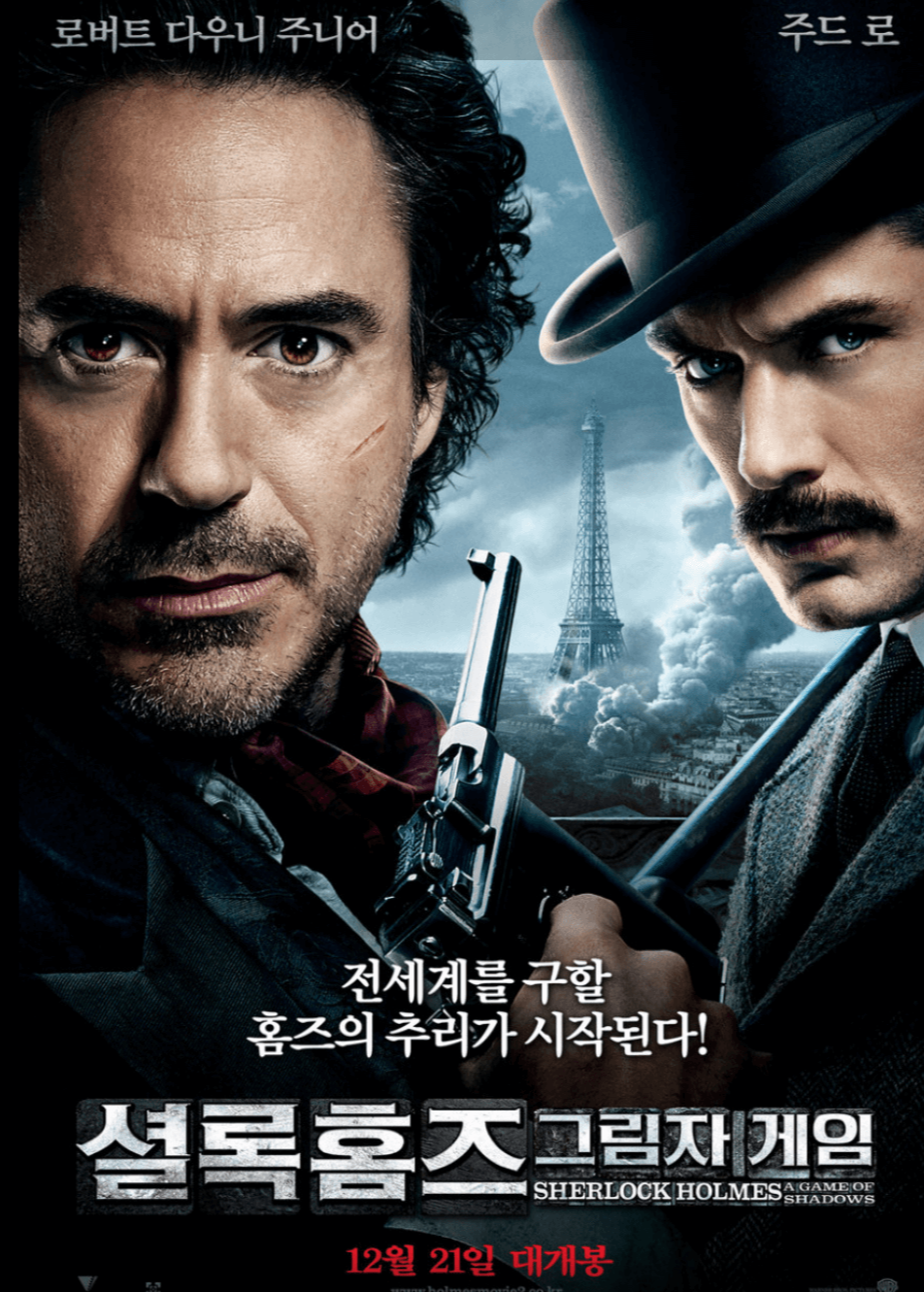 영화 <셜록 홈즈: 그림자의 게임> 은 전작에 이은 2편입니다. 많은 분들이 알고 계시겠지만 소설 '셜록홈즈'를 원작으로 하였습니다. 가이 리치가 감독하고 로버트 다우니 주니어가 셜록 홈즈 역을, 주드 로가 존 왓슨 박사 역을 맡은 셜록 홈스 영화 시리즈의 두 번째 작품으로 2011년에 출시되었다. 영화는 왓슨이 자서전을 작성하며 회상하는 것으로 시작되며 셜록 홈스가 유럽 전역에서 연쇄 폭탄 테러를 조사하면서 첫 영화가 끝난 지점을 포착한다. 홈즈는 이 폭탄 테러의 배후에 있는 주모자가 지적인 범죄 주모자인 제임스 모리아티 교수라고 믿고 있다. 결혼을 앞둔 왓슨은 처음에는 도움을 주기를 꺼리지만, 신혼여행 도중 사건에 휘말리게 된다. 홈즈는 단서를 찾던 중 만났던 심자라는 집시 여성을 만났고 그녀의 행방불명된 오빠가 모리아티와 관련이 있다고 생각합니다. 이들은 그녀의 오빠의 행적을 따라갑니다. 그 끝에는 모리아티가 많은 군수품들을 세계적으로 판매하기 위해 세계대전을 일으키기 위한 음모를 꾸미 있음을 알게 되고 막기 위해 스위스로 떠난다. 스위스 라이헨바흐 폭포에서 홈즈와 모리아티의 싸움을 한다. 부상이 있던 홈즈는 확실한 모리아티의 죽음을 위해 모리아티를 안고 물속에 몸을 던진다. 왓슨과 그의 동료들은 홈즈의 장례를 치루지만 마지막에 등장한 홈즈로 잠재적인 3편에 대한 힌트를 남깁니다. 영화는 숲을 배경으로 한 기억에 남는 싸움 장면과 기차에서의 스릴 넘치는 추격 장면을 포함하여 많은 액션 장면에 슬로를 걸어서 영상미를 더했다. 그리고 홈즈와 왓슨의 케미스트리는 그들의 농담과 파트너십이 많은 유머를 제공하면서 여전히 이 영화의 하이라이트이다.